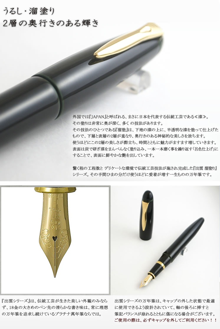 出雲国は、古くから和紙の生産地であり、書く事に対して非常に造詣の深い土地柄です。またプラチナ万年筆創業者である中田俊一氏の生誕の地でもあり、そのご縁から、2010年に島根県出雲市の協力を得て、「出雲シリーズ」を創出。 エボナイトに溜塗り漆で仕上げられた「出雲 溜塗りシリーズ」は、素材を吟味し、各分野の職人が最高の技を施した筆記具で、出雲市が認定する「出雲ブランド」に認定されています。光沢の中に深みのある色が特長の『溜塗り』の万年筆は、その手間ひまに見合った高級感、「出雲」の名にふさわしい神々しい美しさをもつ逸品です。